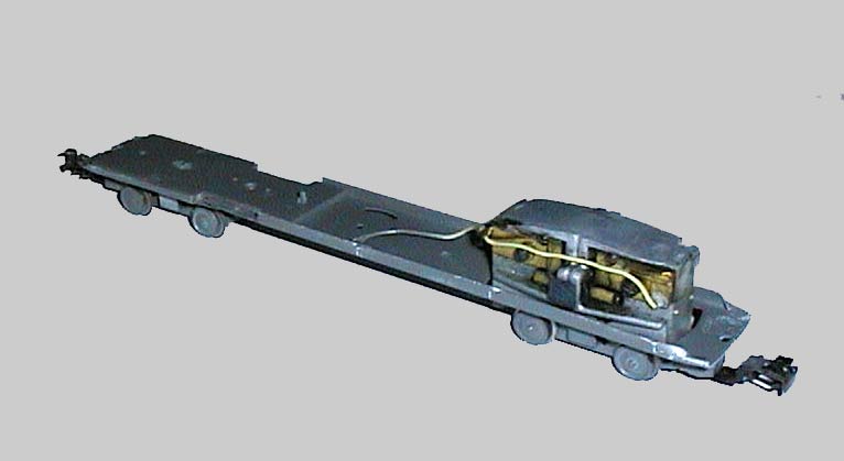 L'entraxe du bogie, trop important, a été réduit. Un essieu a été remplacé par un essieu bandagé, pour accroître les capacités de traction La hauteur du bloc moteur a été descendue à la lime pour éviter de toucher le toit de la caisse. Un ski "maison" a été installé sous le bogie Ainsi équipée, la mécanique fonctionne bien et autorise l'exploitation du modèle sur un réseau à conducteur central. ( La mécanique récupérée provenait d'un matériel "3 rails" ) |